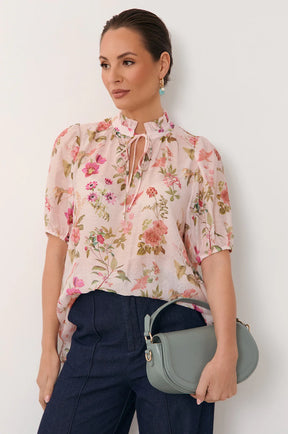 The Sandra Short Sleeve Top in an exclusive adorne print is made from a rayon-nylon blend. It features a V-neckline with tie closure, frill detailing, and short sleeves with elasticated cuffs. Finished with a straight hem.