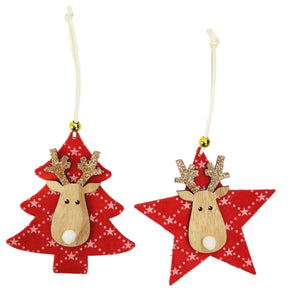 CUTE REINDEER ON STAR & TREE HANGING DECORATION RED 13CM H13X12X1CM (2 ASST)