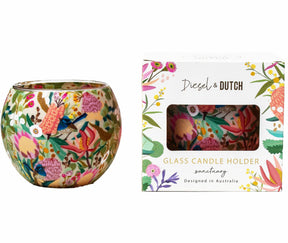 Handmade glass tealight holder featuring blue wrens sitting amongst the soft subtle tones of plants and flowers typically found in the bush.