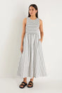 Bryar Ivory Black Stgripe Cotton Sleeveless Shirred Bodice Midi Dress