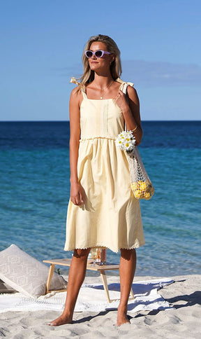A cute light style for summer. This mid length dress has adjustable tie shoulder straps and features beautiful pleating, ruffle and embroidered lace details throughout. Available in lemon and shell pink And Navy.