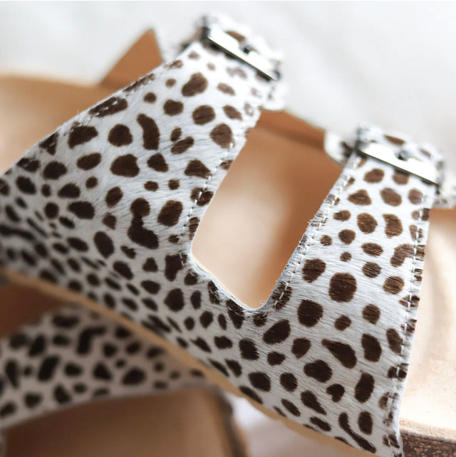 This one comes in a spotted print cowhide which makes them incredibly resilient. It's a small brown spot with an off-white background.