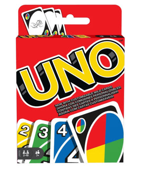 UNO, the classic card game of matching colours and numbers that is easy to pick, impossible to put down, now comes with customisable Wild Cards for added excitement. Players take turns racing to get rid of all their cards by matching a card in their hand with the current card shown on top of the deck. Special Action cards deliver game-changing moments and help defeat opponents. Use the Swap Hands card to change hands with any other opponent and use the 3 customisable (and erasable) Wild Cards to write your own rules! You'll find 19 cards of each colour (red, green, blue, and yellow), plus 8 Draw Two, Reverse and Skip cards in every colour, along with 4 Wild Cards, 4 Wild Draw Four cards, 1 Wild Swap Hands Card and 3 Wild Customisable cards. If you can't make a match, you must draw from the central pile. Don't forget to shout 'UNO' when you only have one card remaining. The player to get rid of all the cards in their hand scores points for any cards their opponents are left holding. The first player to reach 500 points wins