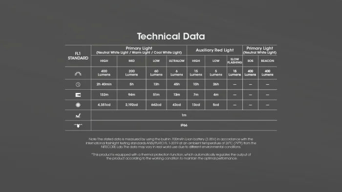 The NU25 MCT UL offers 4 white light brightness levels, a dual-mode auxiliary red light, and special SOS and beacon functions. Easily toggle through settings with the dual-button design, crafted for intuitive use even with gloves.