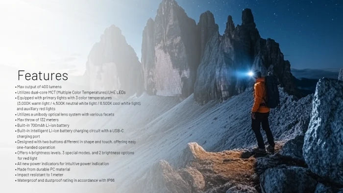 Weighing just 45g, the Nitecore NU25 MCT UL is the ultralight champion of headlamps—engineered for runners, ultralight hikers, and minimalist adventurers. It delivers a 400-lumen max output and features three selectable LED temperatures—3000K, 4500K, and 6500K—for optimal vision across fog, rain, or night terrains.