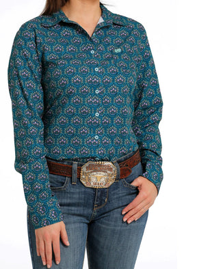 Cinch Ladies Teal Patterned Shirt - XS is backordered and will ship as soon as it is back in stock.