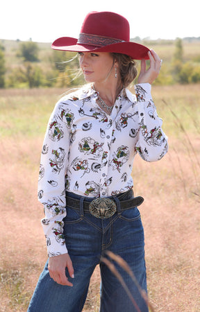 This cream printed rayon shirt combines the tailored Girlfriend fit with authentic Western details. Faux smile pockets, ombre pearl snaps and Cruel Denim logo embroidery accent an all-season sensation that elevates any blue jeans and boots in the closet.