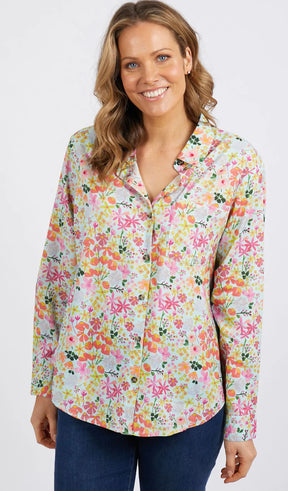 Elm x Laura Blythman pretty as a picture button through shirt. This relaxed fit classic shirt features a scooped hemline and simple collar and cuff. Wear the Laura Shirt with your favourite pair of jeans for a colourful casual look or pair it with your dress pants for a fun evening option.