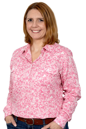JC Women’s Georgie Patterned Work Shirt - Pink Floral / 12 is backordered and will ship as soon as it is back in stock.