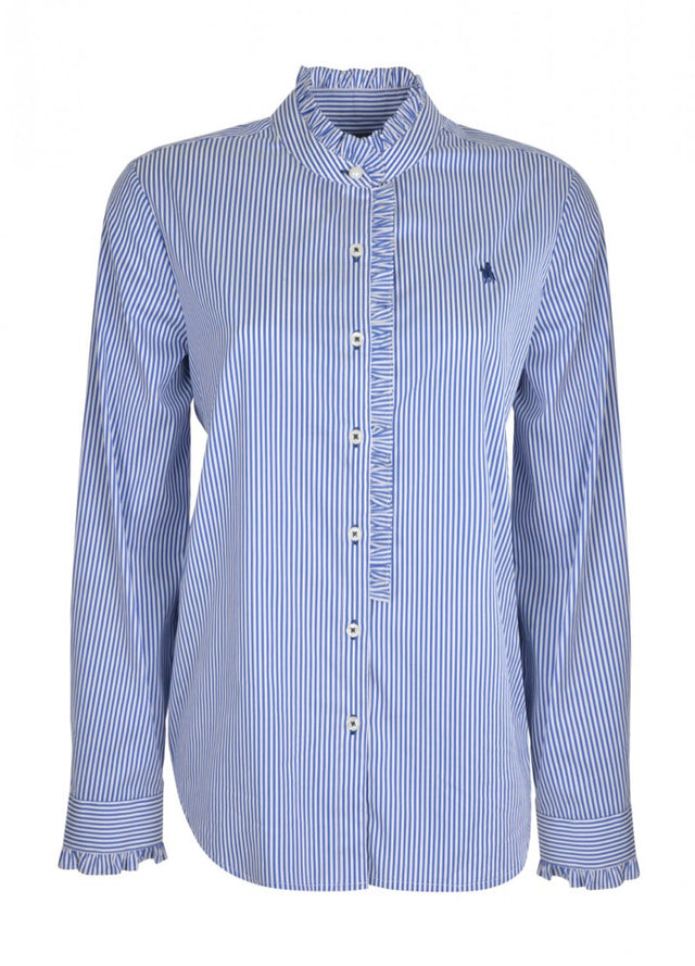 Features: Contemporary stripe style, gathered frill collar, cuffs & placket edge, pearl stand button on collar stand and cuffs, back waist darts, horseman emblem at chest, stretch for comfort