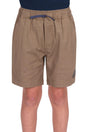 Slant pocket style with elasticated waist in premium textured fabric, stretch for comfort and movement, mock front fly with drawcords, back welt pocket, mock leather hem badge