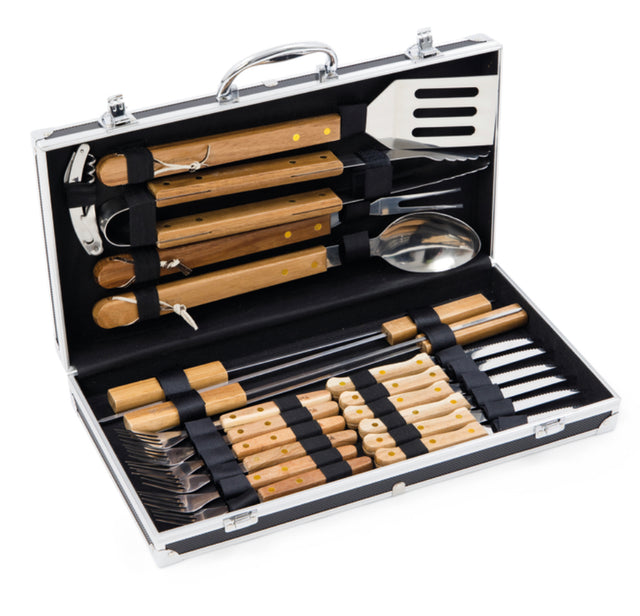 Featuring all the essentials for a BBQ enthusiast, the 22-piece BBQ set is ideal for your next BBQ. Each tool is made from durable stainless steel with wood handles. With 21 pieces plus the aluminium carry case, this set will meet all your grilling needs.