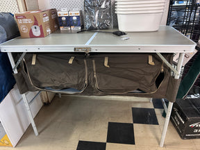 A sturdy, lightweight aluminium folding table with storage underneath. Ideal for camping trips, it includes a 600D fabric storage cupboard with MDF shelves for convenient organisation.