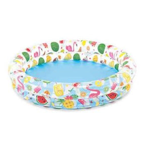 With this cheerful pool, hot summer days are even more fun! Printed with flamingos, pineapples, ice creams, coconuts and other tropical attributes. 1.22m x 25cm inflated 0.20mm rings; 0.18mm floor 2 rings Capacity 18cm of wall height: 150L Repair patch"