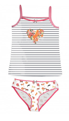 Features: Singlet and underwear pack, Thomas Cook original hand drawn print, pink elastic trim, satin bow, stretch for comfort and movement