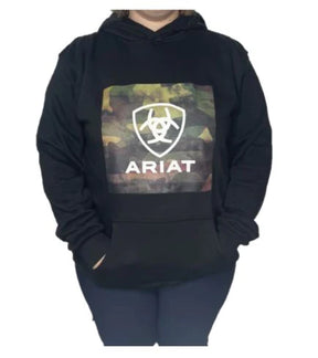 - Block camouflage on chest with Ariat logo.