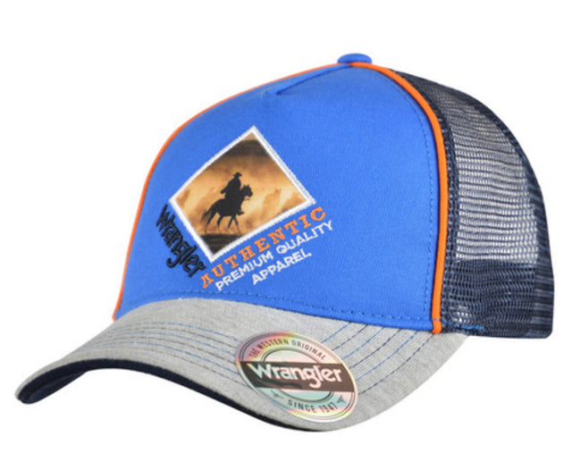 One Size, 5 Panel trucker cap, front multi colour Wrangler embroidery, peak with embroidery, contrast sandwich peak, contrast crown piping, Wrangler back embroidery