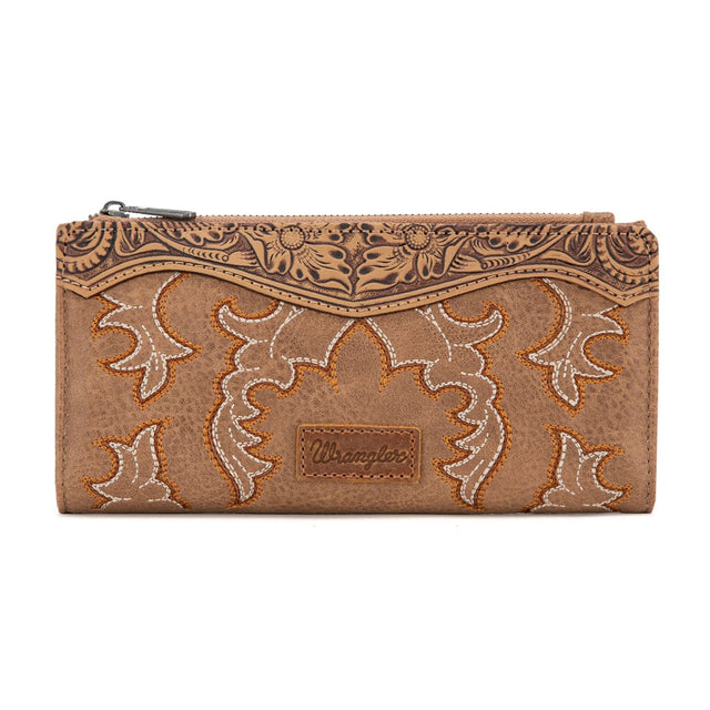 This Wrangler wallet features an embroidered boot scroll design with tooled trim and a press stud closure. It includes a zippered pocket, 10 card slots, 1 ID slot, and 3 compartments for notes. Crafted from durable PU material, it measures 19cm by 9.5cm and is finished with a Wrangler® logo badge.