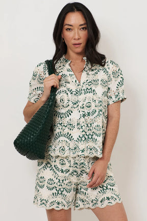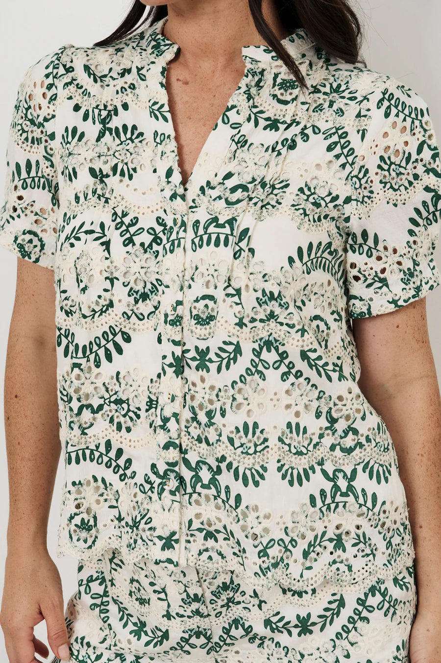 The Khloe Embroidered Top in Print features an exclusive Adorne print with delicate embroidered motifs. Designed with a mandarin collar and V-neckline, it’s a relaxed button-down style finished with a scalloped hem and full lining.