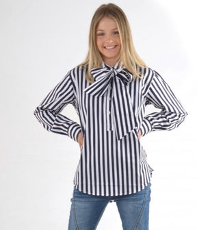 In classic navy stripes this shirt is semi fitted, tab front, collar has loops with a separate tie which can be used as a bow, removed to use in your hair or belt. 100% Cotton Hand sewn button feature Semi fit Bull embroidery Designed in Australia. Made in China.