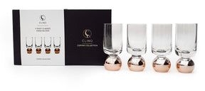 Our shot glass set of 4 has been designed in house by the CLINQ team. Hand-blown and made from lead-free glass, these stunning shot glasses can be used for any tipple served straight. The copper detail on the ball base creates a unique design that won’t go unnoticed.