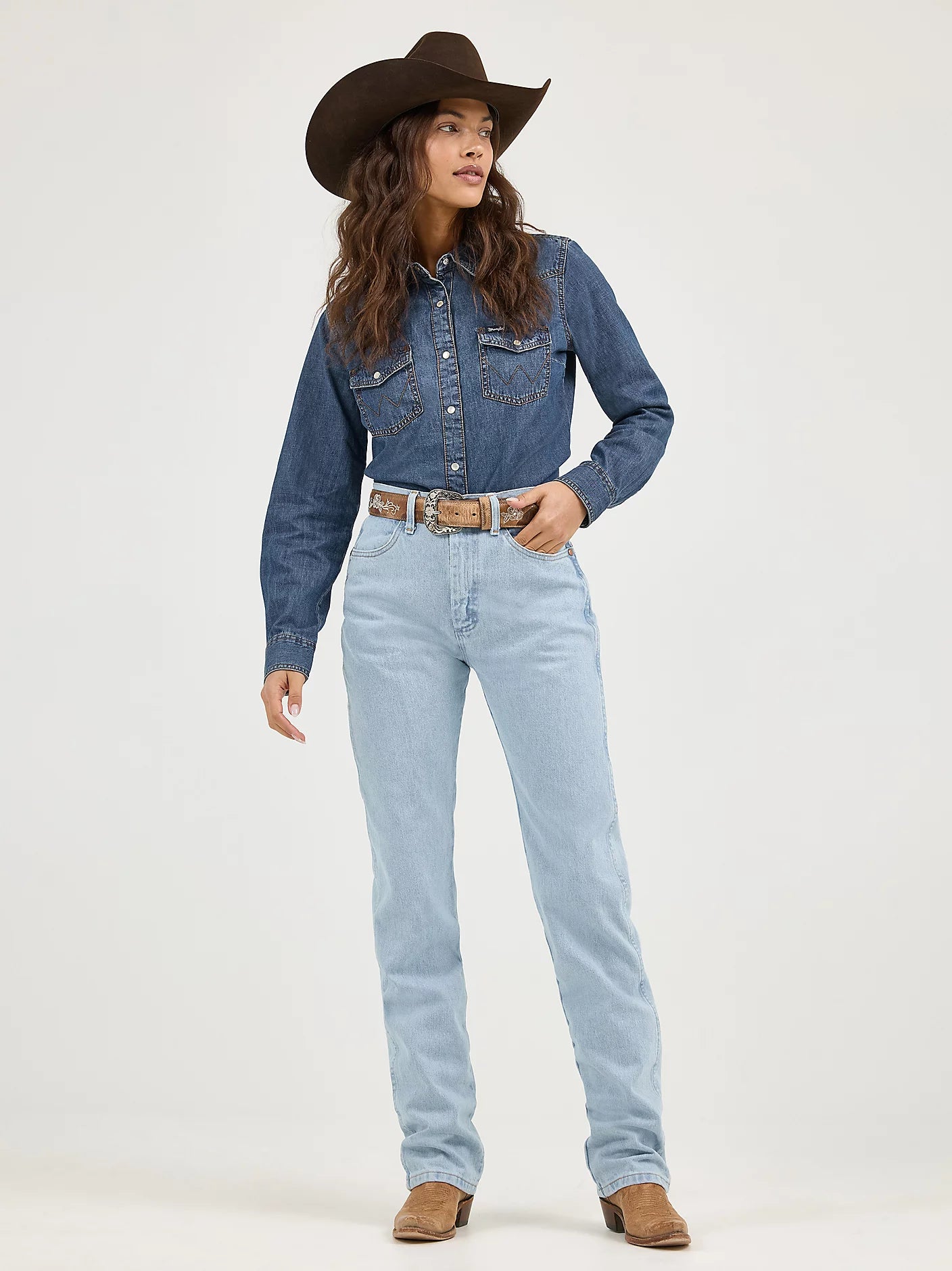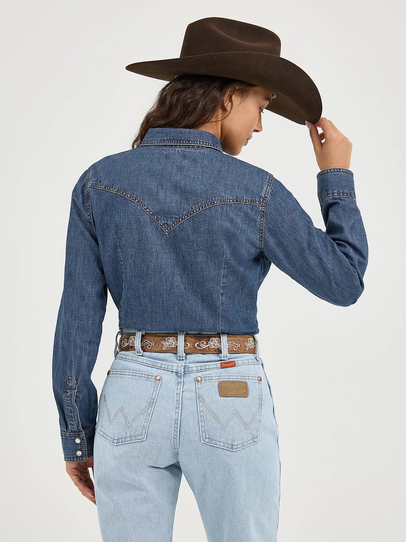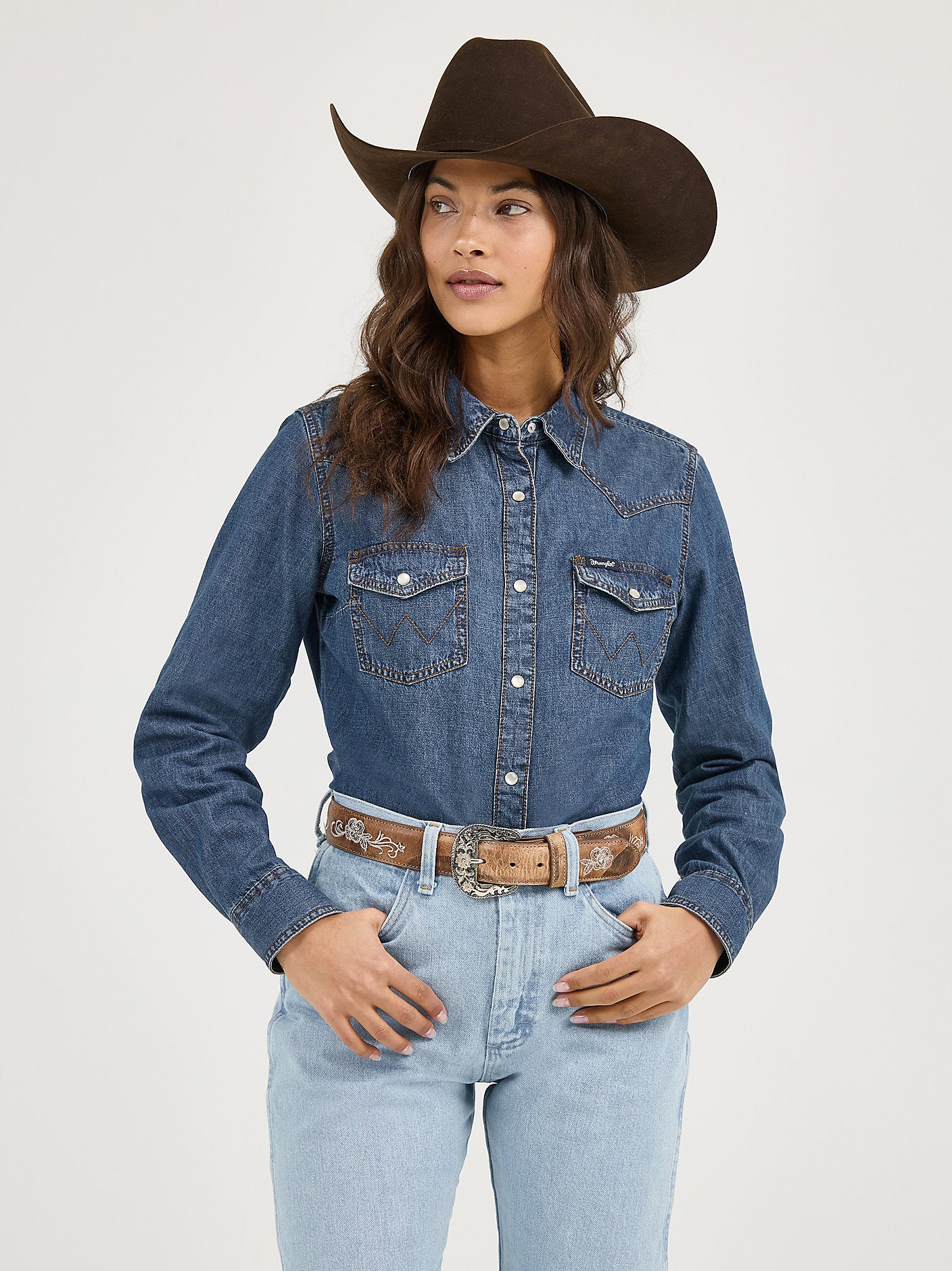 No Western wardrobe would be complete without a classic snap shirt. Combining the 100% cotton denim you love with the clean and simple silhouette you can always depend on, the women's Wrangler Western snap denim shirt offers up vintage cowgirl style with some contemporary attitude. This long-sleeve snap shirt comes with many of the iconic Wrangler details you look for as signs of superior quality, including Western front and back yokes and genuine pearl snaps as well as snap flap pockets with our signature 'W' embroidery. Whether you wear it during the week or you save it for the weekend, you're guaranteed to get compliments anywhere you go. Now available in multiple washes to help you keep your closet stocked in style.